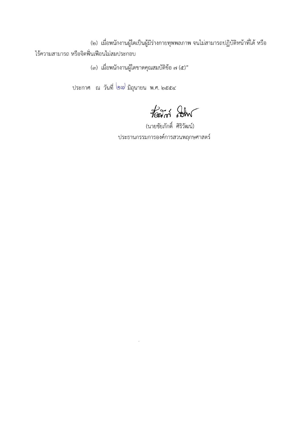 | ประกาศเรื่อง ข้อบังคับองค์การสวนพฤกษศาสตร์ ว่าด้วย การกำหนดตำแหน่ง การบรรจุแต่งตั้ง เลื่อนขั้นเงินเดือน และการออกงาน (ฉบับที่ ๒) พ.ศ.๒๕๕๔ |