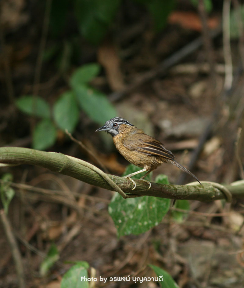 นกขนาดเล็ก ตัวสีน้ำตาลอมส้ม ปากสีดำหน้าผากสีเทาลายดำ มีคิ้วสีดำลากยาวเลยตา ที่คางมีกระจุกขนสีเทาล้อมรอบด้วยสีดำดูคล้ายเครา ขาสั้นแข็งแรงสีเหลือง