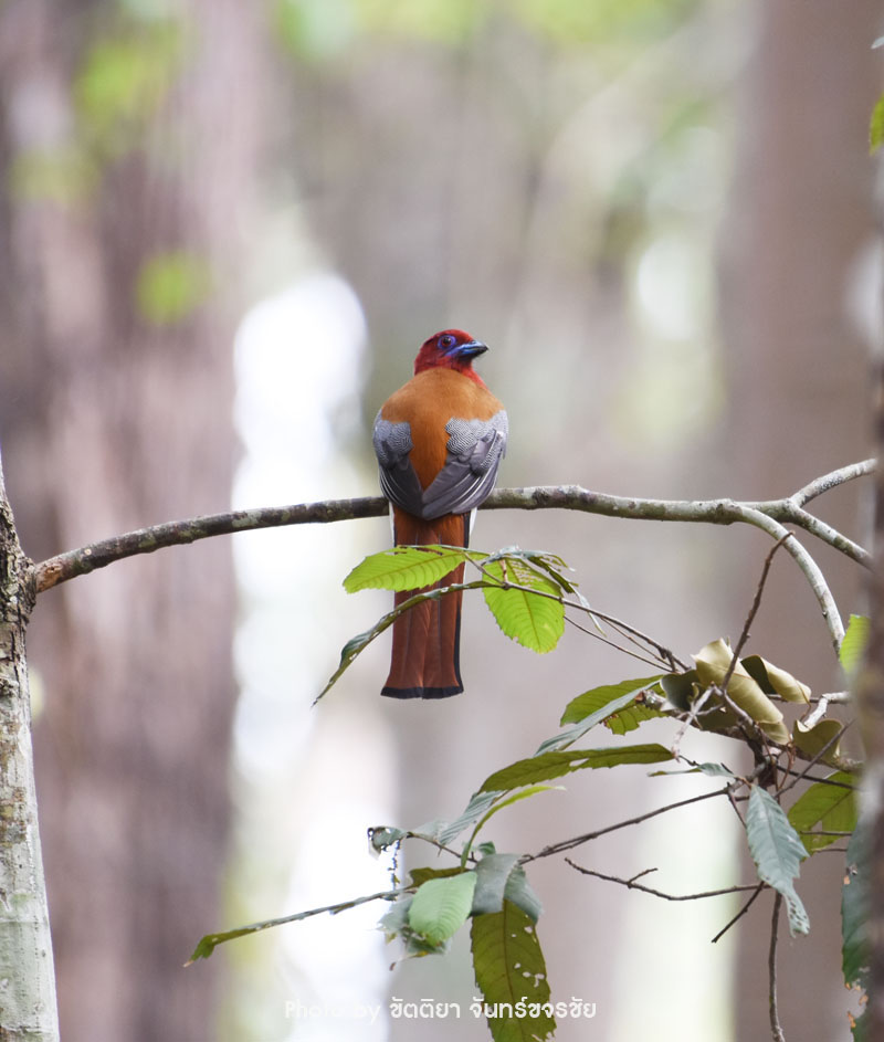 นกขนาดกลาง หัวกลมโต เพศผู้ลำตัวสีแดงสด ปากและรอบตาสีน้ำเงินอมม่วง หลังสีน้ำตาลน้ำตาลแดง อกมีแถบสีขาวพาด ปีกสีดำมีลายตารางสีขาวกระจายทั่ว หางยาวสีน้ำตาลแดง ด้านล่างมีแถบขาวที่ขอบ เพศเมียคล้ายเพศผู้ แต่หัวเป็นสีน้ำตาล ปีกสีน้ำตาลมีลายตารางสีขาว