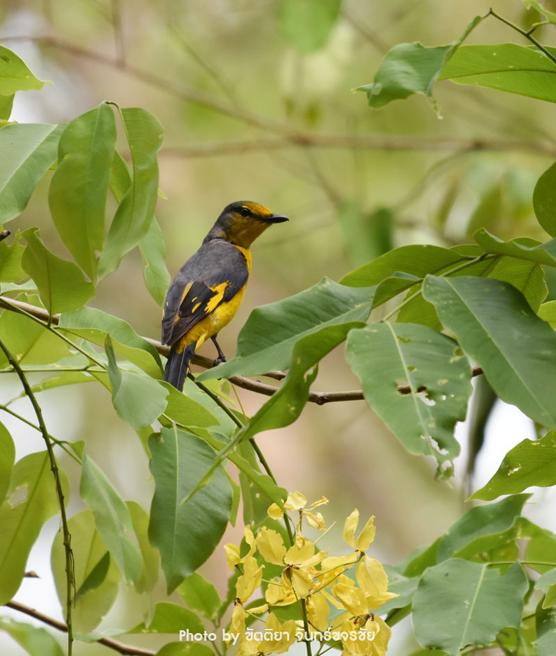 นกขนาดเล็ก ลำตัวเพรียวยาว เพศเมียหน้าผากสีเหลือง ท้ายทอยและหลังสีเทา ปีกสีดำมีแถบสีเหลืองกระจาย สะโพกสีเหลืองหางด้านบนสีเทามีขอบสีเหลือง ท้องและคอสีเหลืองสด