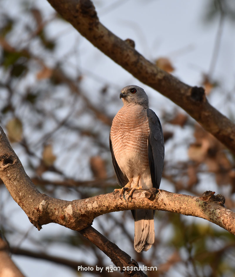 นกขนาดกลาง หัว ลำตัวด้านบนสีเทา คอสีขาว ท้องสีน้ำตาลแดงจางๆ มีลายขีดขวาง หางด้านบนสีเทามีแถบ หัวและลำตัวด้านบนเทาแกมฟ้า ลำตัวด้านล่างขาว คอขาวมีเส้นกลางคอสีเข้ม อกและท้องมีลายขวางถี่สีส้มแกมน้ำตาลแดง หางด้านบนสีเทาด้านล่างมีลายขวางสีเข้ม เพศผู้ตาสีแดง เพศเมียตาสีเหลืองและมีสีหม่นกว่า