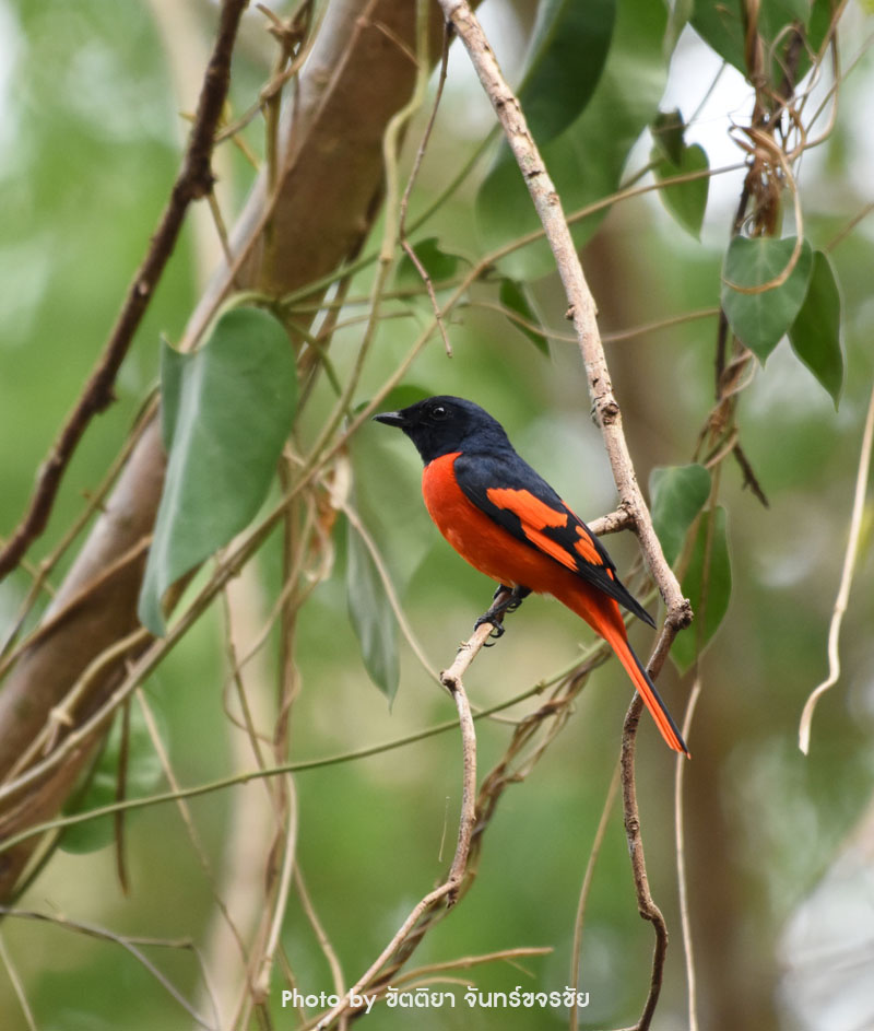 นกขนาดเล็ก ลำตัวเพรียวยาว เพศผู้ หัว คอ หลัง และปีกมีสีดำ บนปีกมีแถบสีแดงสดกระจาย หางด้านบนสีดำขอบหางสีแดง อกและท้องสีแดงสด เพศเมียหน้าผากสีเหลือง ท้ายทอยและหลังสีเทา ปีกสีดำมีแถบสีเหลืองกระจาย สะโพกสีเหลืองหางด้านบนสีเทามีขอบสีเหลือง ท้องและคอสีเหลืองสด