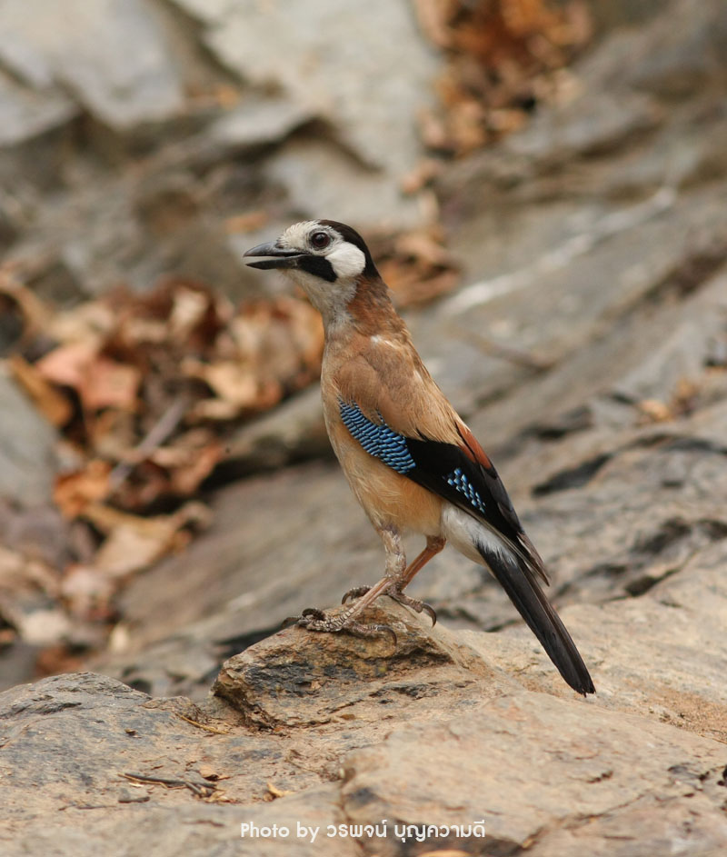นกขนาดกลาง หน้าผากสีขาวท้ายทอยดำ หัวสีขาว มีป้ายสีดำที่โคนปาก หลังสีน้ำตาล ปีกสีดำ มีลายสีน้ำเงินสลับดำที่ขนคลุมปีกบิน หางด้านบนสีดำ คอสีขาว อกและท้องสีน้ำตาล ก้นสีขาว